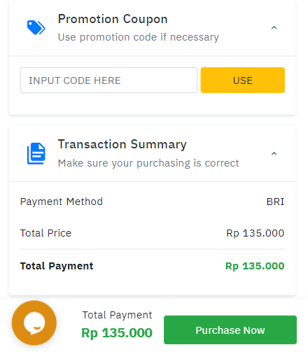 Kamu bisa masukkan kodepromo di Kolom Promotion Coupon, jika tidak ada kode promo kamu bisa lihat rangkuman transaksi yang kamu pesan, kemudian klik Purchase Now